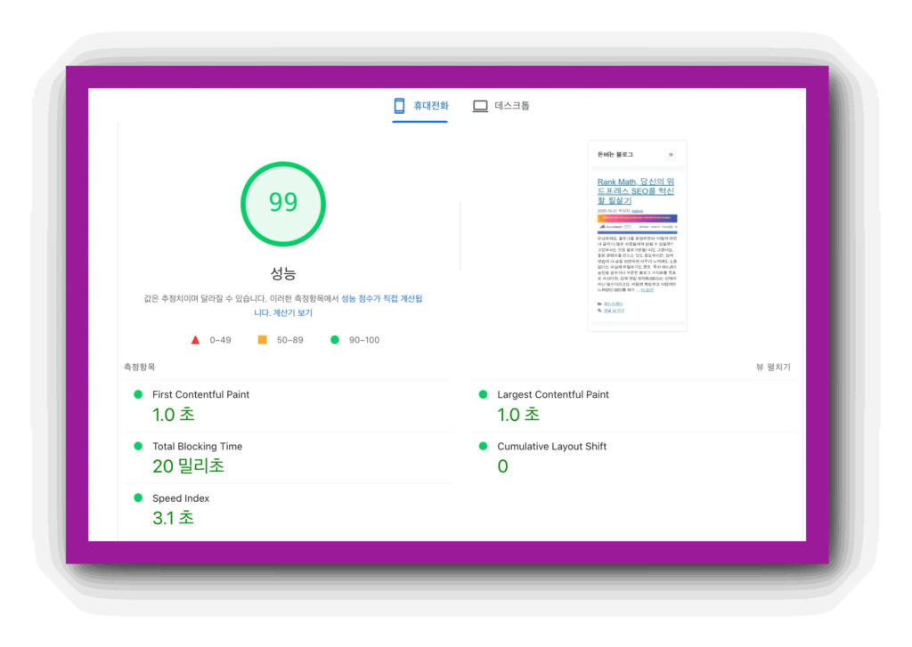 LiteSpeed Cache 실전 설정을 소개해 드려요. 더 나은 방법을 찾으실 수 있을거예요. 아직 이 플러그인에 대해서 잘 모르시는 분도 속는샘치고 해 보세요. 제가 처음 워드프레스 설치하고 속도 체크할 때 아래 보여지는 수치는 제게는 꿈의 수치였어요. 하지만 이 플러그인을 설치하고 세팅하면 놀라운 속도 변화를 경험할 수 있어요.