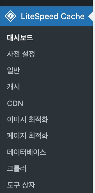 파일 선택을 누르시고 다운로드 된 곳을 찾아서 다운받은 플러그인을 선택하세요. 그리고 따라서 진행하시고 최종적으로 활성화를 눌러주세요. 제대로 설치가 되었으면 왼쪽과 같이 관리자 페이지 메뉴에 LiteSpeed Cache 라는 메뉴가 생성된걸 보실 수 있어요. 안보이시면 새로 고침을 한번 해 보세요. 페이지 새로고침을 모르신다면 그것도 알려드릴 수 있지만 구글에서 검색해 보세요.
